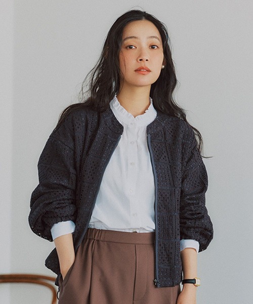 カジュアルにも綺麗めにも使える春アウター裾のアレンジも楽しめるレースブルゾンーーー【素材】ポリエステルのパネル柄レースを使用。裏地付きで透けにくいのでしっかりとアウターとしてご着用いただけます。【デザイン】春らしいレース柄のブルゾン。寒さが残る今の時期も、中にしっかりと着込むことができるゆったりとしたサイズ感です。裾のドロストで裾幅を調節できるので、ブラウジングして着丈を調整していただくのも◎アウター ブルゾン レースーーー【スタイリング】デニムやチノパンに合わせて大人なカジュアルスタイリングに、スカートや綺麗めパンツと合わせて女性らしい着こなしに。ゆったりとしたサイズ感なので、ニットやスウェットなど厚手のトップスを合わせていただくことで今の時期からでもご着用いただけます。