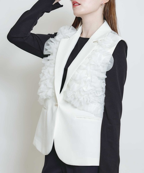洒落感たっぷりでエレガントなチュールジレ。ほんのりストレッチのある生地を使用。柔らかくさらりとした肌触りで快適な着心地が感じられます。フロントに立体感のあるチュールを施す事で華やかさをプラス。パールボタンを採用する事でより上品さが引き立ちます。同色のチュールなので落ち着いた雰囲気でまとまり、甘すぎないのもポイント。軽やかなチュール素材をドッキングしカチッとしすぎない柔らかい印象に。女性らしさを纏ったどんなコーデにも馴染む万能アイテムです。スラックスやフレアスカートなどきれいめコーデとの相性抜群。デイリーにもお呼ばれコーデにも重宝する一着です。※パールボタン縫い付け※ポケット付き【詳細情報】厚み:□薄手 ■ふつう □厚手透け感: ■なし □あり光沢感: ■なし □あり伸縮性: ■なし □あり裏地: □なし ■ありポケット:□なし ■あり重量: 約410g※撮影場所や明るさにより実際の商品と色味が若干異なる場合がございます。 ☆商品のお気に入り♡登録を押せば”再入荷通知”や”残りわずか通知” 値下げのお知らせが届きます!お気に入りのブランド登録していただければ新商品入荷のお知らせも届きますので是非登録してみて下さい。