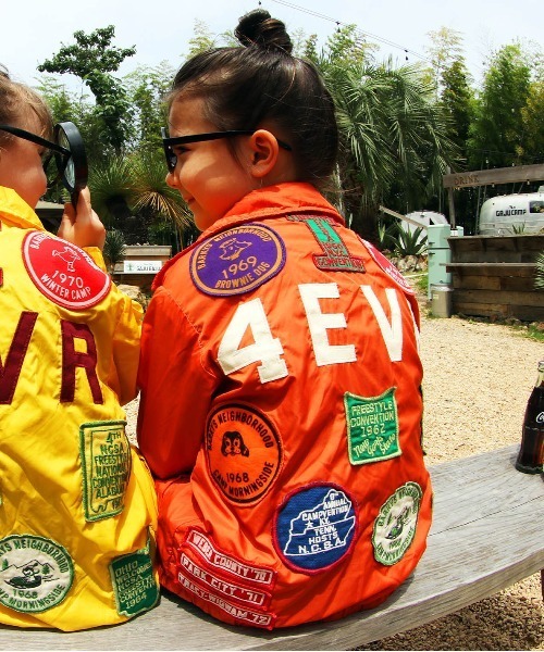 愛犬チームのコーチジャケット。後一杯に愛犬と参加したワッペンを持ち主が思い出として付けた設定存在感抜群なので迷子にならないです。