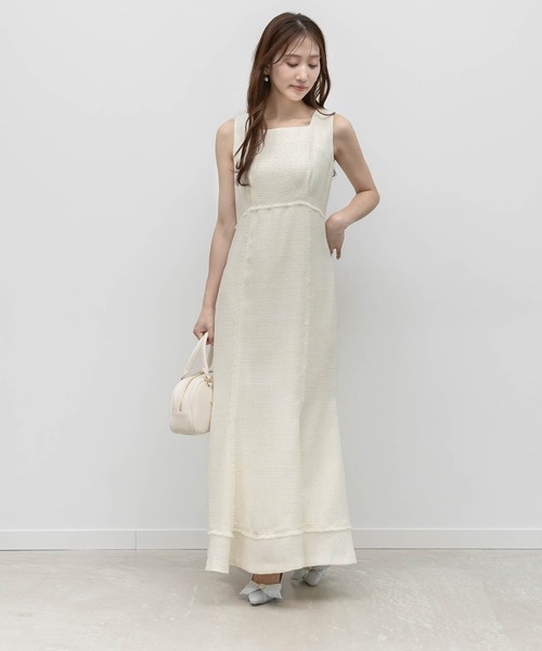 ◆2026SS新商品◆ 華やかなフリンジツイードのマーメイドワンピース。 同素材のジャケット(BJ37096)と合わせれば、特別な日にも映える上品なセットアップスタイルが完成します。 POINT ・ツイード素材で上品な存在感を演出 ・スクエアネックがデコルテを美しく見せ、洗練された印象に ・ウエストのタックで自然に立体感をプラス ・フリンジを効かせた切り替えが、立体的でリュクスな表情に ・ウエストの後ろはシャーリングで快適なフィット感を実現 ・後ろファスナー仕様 ・後ろ襟ぐり上部のビジューボタンでバックスタイルも華やかに ・サイドポケット付きで実用性も◎ ・裾は太めの切り替えデザインで足元を軽やかに COORDINATE 同素材のツイードジャケット(BJ37096)を羽織れば、オケージョンにも映える上品セットアップスタイルに。 単品では、シアータートルやブラウスをレイヤードして、季節を問わず着回せるのも魅力。 足元はミュールやポインテッドトゥパンプスを合わせて、女性らしいムードを演出。 - - - - - - - - - - - - - - - 洗濯方法:家庭洗濯不可 透け感:なし 裏地:あり 伸縮性:なし 生地の厚さ:普通 - - - - - - - - - - - - - - -