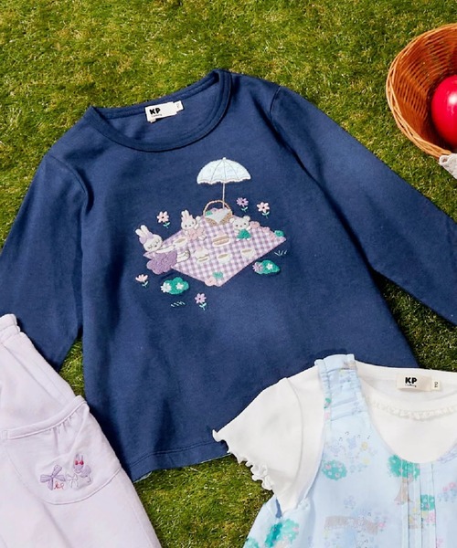 mimiちゃんが、お友達とピクニックをしている様子のアップリケ刺しゅうが入った長袖チュニック。後ろ身頃は、同じモチーフのローンの総柄プリントで、ギャザーを入れた切り替えデザインです。前後どちらから見ても可愛らしく、1枚で着映えするアイテム。80、90cmサイズは、着脱しやすい左肩あきの仕様になっています。