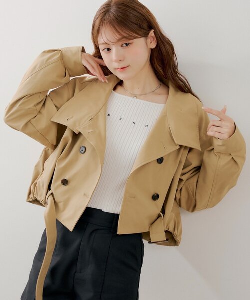 今季トレンドのショート丈トレンチコートが登場!▶商品ポイント・トレンド感あふれるショート丈で、スタイルアップも叶うトレンチコート。・スタンドネックにすることで、顔周りをすっきりと見せてくれます。襟を折って着れば、定番のトレンチスタイルも楽しめます。・ウエストベルトでマークすることで、メリハリのあるシルエットにも。▶スタイリングポイント・ミニボトムと合わせるとフェミニンなスタイルに仕上がります。・レースアイテムとも好相性でおすすめです。・デニムパンツに合わせると、大人カジュアルスタイルにも。▶洗濯表示洗濯:手洗い可タンブル乾燥:不可アイロン:低温処理可※110度までクリーニング:ドライ・ウエット可※取り扱い注意事項(詳しいお手入れ方法は商品タグをご参照ください・洗濯ネットを使用してください。・濃色製品は、色移りすることがありますので、他の物と分けて洗濯してください。・濃色の場合は、汗や雨などで濡れた状態や強い摩擦等で他の製品に色移りする場合がありますのでご注意ください。・素材の特性上、多少縮むことがあります。・アイロンの際は、当て布をしてください。……………………透け感:なし厚さ:普通伸縮性:なし裏地:なし……………………--------------------------------------------▼お気に入り登録のおすすめ▼ハートをクリックしてお気に入りに登録すると完売カラーの再入荷や残り1点の通知、セールの通知を受けとることができます。▼ブランドのお気に入り登録▼新商品や再入荷、セール通知やショップのおすすめトピックスなど、いち早くブランドの情報を受け取ることができます。▼メルマガ登録▼Chicoのお得な情報やニュースを一足先にお届けします。--------------------------------------------※商品について・サイト上のカラー名と、お届け商品に記載されているカラー名が異なる場合がございます。・商品の色味は、撮影場所や光のあたり具合などにより色味が違って見える場合がございます 。また、お客様のお使いのPCのモニター環境などにより色味が違って見える場合がございます。予めご了承の上ご注文下さい。・セールは予告なく終了させていただく場合もございます。※商品ページでは、遅延などの影響も考え、お届け予定時期を少し先に設定させていただいております。予約商品は商品ページに記載しているお届け予定時期よりも早いお届け予定になる場合がございますので、予めご了承ください。※返品・キャンセルについて・着用、洗濯後の返品、交換は致しかねます。・商品到着後、着用前に商品を確認して頂きますようお願い致します。※画像の商品はサンプルです。実際の商品と仕様、加工、サイズ、素材が若干異なる場合がございます。※ご注文いただいた予約商品のお届け時期の確認は、注文履歴ページより行えます。