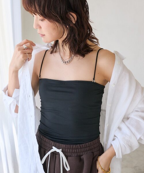 様々なスタイルに合わせやすいキャミソール ●デザイン ・下着のラインを気にせず使えるパット付のキャミソール ・華奢な肩紐で洋服のデザインを邪魔せず楽しめる ・肩紐は取り外しが可能でベアトップとしても着用可能 ・ストラップ部分は長さの調整が可能 ・パット部分の見返しを2枚仕立てにしておりパットの透けを気にせず着用可能 ・薄手の生地を採用しておりラインが響きにくい ●素材 ポリエステル 92% ポリウレタン 8% ・薄手で滑らか、伸縮性がある生地 洗濯方法:洗濯機弱洗い可(湯温30度まで) 透け感:なし 裏地:あり(カップ部分) 伸縮性:あり 生地の厚さ:薄め 光沢:なし 【MYSELFbyRD(マイセルフバイリヴドロワ)】 自分自身に近い服 上質で、快適で、着る事によって自信につながる インナーウェアを中心としたラインナップ 四季の移り変わりが曖昧な昨今 何を着たら快適なのか迷う時に思わず手に取りたくなる 毎日着用していたくなる快適な素材感、シルエット 自分自身を心身ともに癒してくれるアイテムたちを展開 -------------------------------------------------------------------------------- 【お買い物をもっと便利に楽しく♪】 『♡』をクリックでお気に入り登録 ✓「商品のお気に入り登録」で・・・ ラスト1点や再入荷の通知が届きます。登録して頂いた商品だけが対象となる、あなただけのタイムセールが開催されることも! ✓「ブランドのお気に入り登録」で・・・ 新商品や再入荷など、いち早くブランドのお得な情報を 受け取ることができますので、ご登録をおすすめします! -------------------------------------------------------------------------------- 【注意点】 ※画像の商品は光の照射や角度、お使いのモニター環境により、 実物と色味が異なる場合がございます。 ※入荷状況により、お届け予定が前後する場合があります。 ※お客様への発送が店頭販売より遅れる場合もあります。 ※追加生産商品は、一部の店舗、通販で販売中の場合がございます。 予めご了承下さい。 ----------------------------------------------------------------------