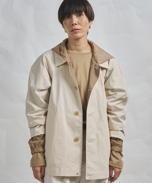 【2026SS】気分やスタイルに合わせて変化できるリバーシブルショートコート■リバーシブルで着用いただけるハーフ丈のブルゾンコート。■コットンナイロンのタイプライターとリサイクルナイロンのタフタ素材を使用した一枚。■ゆったりとしたシルエットでフードを重ね着したようなデザイン。■2重仕立てでも、とても軽く窮屈感なく着用可能。■表のステンカラーコート、裏のナイロンパーカー面それぞれのスタイルを楽しめる万能アイテム。【COLOR】ベージュ:オフホワイト×キャメルベージュのナチュラルな配色。カーキ:ライトイエロー×カーキの遊び心のある配色。【STAFF COMMENT】■身長158cm|普段サイズ S~M|着用サイズ Fリバーシブルで着用できる着回し力抜群の軽アウター。ゆったりシルエットで、中にしっかり着込めるのもポイント。表と裏で配色が違うので、1枚でレイヤード風にお洒落に着こなせます。■身長166cm|普段サイズ L~XL|着用サイズ Fリバーシブルでカラーが違う、コーディネートの幅が広がるコート。パーカーとステンカラーコートの使用でカラーだけでなくシルエットにも変化を出せる、わがままを叶えるアイテムです。----------------------------------------------------洗濯方法:手洗い可透け感:なし裏地:リバーシブル仕立て伸縮性:なし光沢感:なし----------------------------------------------------― GEMINI(ゲミニー) ―双子/双子座ラテン語で双子の意味。もう一人の私に選ぶ服双子のようにいるもう一人の私に、服を選ぶ感覚がある。自分の中の二面性に向き合って、気分やシチュエーションの数だけ服を選ぶ。服と体温が同じになったとき、もう一人の私になれるような気がする。そうやって私は、自分を新しく変えていく。【注意事項】・画像の商品はサンプルです。実際の商品と仕様、加工が若干異なる場合があります。また 、パソコンやスマートフォンのモニター環境などにより、色味が違って見える場合があります。・店頭及び屋外での撮影画像は、光の当たり具合で色味が違って見える場合があります。商品の色味は、スタジオ撮影の画像をご参照ください。・入荷状況により、お届け予定が前後する場合があります。・お客様への発送が店頭販売より遅れる場合があります。・追加生産商品は、一部の店舗、通販で販売中の場合があります。予めご了承下さい。【気になるアイテムは、「お気に入り」登録を】ハートマークをクリックしておくことで、スムーズにお買い物が楽しめます。・ラスト一点のお知らせ・再入荷のお知らせ・SALEのご案内