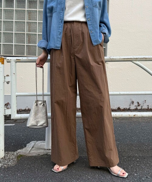 "◇fredy emue◇ 【2026 SS】 ラフすぎない、大人のタックギャザーパンツ ●point ・コットンナイロンの程よくハリ感のある素材を使用したタックギャザーパンツ ・タックとギャザーでボリュームを持たせながらも、広がりすぎない立体的なシルエットに仕上げました ・ウエストはゴム仕様+前開きデザインでイージーな履き心地ながらラフすぎない印象に ・ボディラインを拾いにくいワイドシルエットで今っぽいバランスが叶います ・さらりとした素材でお手入れもしやすく、汗ばむ暑い時期でも涼しく快適に着用いただけます ・きちんと感とリラックス感を両立した万能な一枚です ●STAFF着用コメント 156cmスタッフ: 丈はフラットシューズでもバランスよく履ける長さです。 ウエストはゴム仕様で楽な履き心地◎ 程よいハリ感があり、ワイドでもすっきり見えました! 透け感:なし 裏地:なし 伸縮性:ウエストあり 光沢感:なし 洗濯:手洗い可 ◇商品のお気に入り登録◇ 気になる商品は、お気に入り登録がオススメです! クーポン情報、入荷情報が、通知されるようになります。 ※お手入れの際は、商品についている品質表示タグの取扱い表示をご確認ください。 ●お取扱い上のご注意● *商品を長くご愛用していただきたいため、アテンションタグがある場合は必ずご確認の上、着用又はお取り扱い下さい。 *画像の商品はサンプルとなりますので実際の商品と仕様(主にファスナー・釦等の付属品)、加工、サイズが若干異なる場合がございます。 *店頭及び屋外での撮影画像は、光の当たり具合で色味が違って見える場合があります。商品の色味は、スタジオ撮影の画像をご参照下さい。 *商品画像に関しては出来る限り忠実に表示出来るよう努めておりますが、お客様がご利用のモニターの設定及び特性により、実際の商品と比較し色味に若干の誤差が生じる場合があります。 *製品洗い加工の商品は、多少の歪み、シワなどが見られたり、風合いやサイズ等が1枚1枚異なります。汗や雨等で濡れた時や、摩擦により色落ちし、他の衣料を汚すことがありますので(特に濃色のもの)ご注意ください。 ※サンプルでの採寸のため、サイズ表はあくまで目安となります。予めご了承ください。"