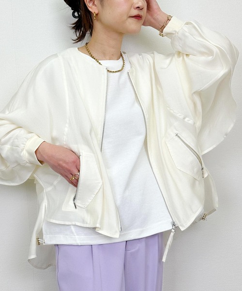 LUGIVA-ルギヴァ- スポーティーやミリタリーのもつマニッシュテイスト機能性と 柔らかさのある 女性的なディティールを加えた ”今の私の感覚”と”ワードローブに残る心地良さ” を大切にすることを提案するブランドです。 風をまとうバックギャザーフリルブルゾン 柔らかく、ほんのり落ち感とシボ感のある生地は、軽やかで優しい透け感。 ノーカラーですっきりとした首元。ドルマン風のゆったり袖は、動きやすくこなれた雰囲気に。 袖口は柔らかなリブで、きちんと止まりつつも楽な着心地です。 後ろヨークにはゴムギャザー入り。 さらにヨークから袖にかけてあしらったフリルが、ひらりと揺れて目を引きます。甘すぎず、さりげなく華やか。 前後差のある丈とサイドスリットですっきりとした印象もプラス。 色は優しいオフホワイトと、深みのあるカーキ。 キレイめにも大人カジュアルにもマッチし、羽織るだけでこなれスタイルが叶う一枚です。 ※YKKファスナー 【詳細情報】 厚み:■薄手 □ふつう □厚手 透け感: □なし ■あり 光沢感: ■なし □あり 伸縮性: ■なし □あり 裏地: ■なし □あり ポケット:□なし ■あり 重量: 約330g ※撮影場所や明るさにより 実際の商品と色味が若干異なる場合がございます。 ☆商品のお気に入り♡登録を押せば ”再入荷通知”や”残りわずか通知” 値下げのお知らせが届きます! お気に入りのブランド登録していただければ新商品入荷のお知らせも届きますので 是非登録してみて下さい