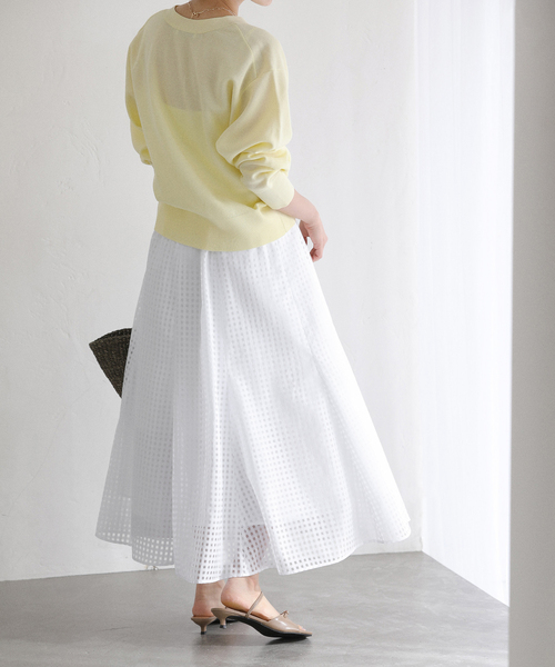 【2026SS】 LaTotalite 軽やかな透け感が魅力のシアーチェック素材を使用したパネルスカート。 動くたびにふんわり広がるフレアシルエットが女性らしく、シンプルなトップス合わせでも華やかな印象に。 ウエストはすっきり見えつつ、程よいボリューム感でスタイルアップ効果も◎ ご自宅でお手入れできるイージーケア素材なので、デイリーからお出かけまで気負わず着回せる一枚です。 春夏らしい軽やかなカラー展開もポイント。 ********************** 透け感:ホワイト(010)のみ有り 裏地:あり 伸縮性:なし 光沢感:なし 生地の厚さ:普通 ********************** 【スタッフ着用コメント】 《スタッフ名:mizuki》 身長:160cm/体型:普通/普段サイズ:S~M/着用サイズ:38 サイズ感:ジャストサイズ。ウエストはバックゴム仕様で適度なフィット感あり。 素材感:シワになりにくいポリエステル素材。 着心地:ウエストはバックゴムになっているので楽な履き心地。 ********************** ※お取り扱いについて 040(ネイビー) 他の製品に色が映ることがありますので、単独で洗ってください。 ※取り扱いについては、商品についている品質表示でご確認ください。 ※照明の関係により、実際よりも色味が違って見える場合があります。 またパソコン・スマートフォンなどの環境により、若干製品と画像のカラーが異なる場合もございます。 ※商品の色味は、商品アップ画像をご参照ください。 着用モデル身長: 162cm 着用サイズ:38 本体:手洗い可能