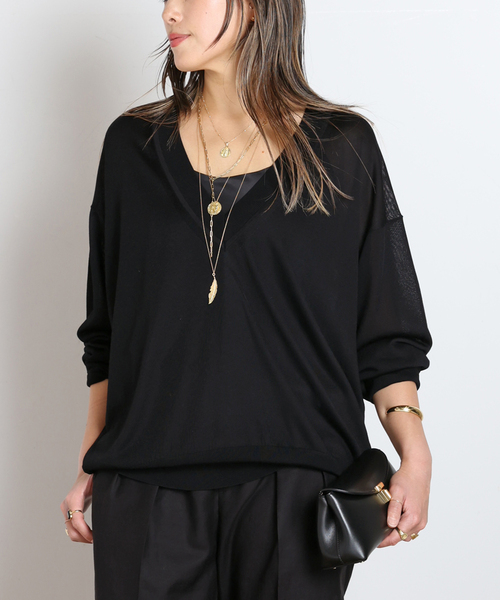 品のあるレディライクな着こなしにぴったりのライトVネックニット。程よい光沢感と肌触りの滑らかな編地で素肌にも着やすい一枚。潔くデコルテの出る深い衿あきですが、カジュアルなアイテムとも相性良く着こなしやすいバランスの取れたデザインです。ゆったりとしたサイズ感なのでハイゲージでもボディラインを拾わず着こなしていただけます。ブラックとニュアンス感のあるキャメルカラーでモダンなスタイリングが決まりやすく、サテンキャミソールをレイヤードし女性らしく着て頂くと、デニムなどタフなボトムスも品良く纏まっておすすめです。※照明の関係により、実際よりも色味が違って見える場合があります。またパソコン・スマートフォンなどの環境により、若干製品と画像のカラーが異なる場合もございます。※商品の色味は、商品アップ画像をご参照ください。モデルサイズ:身長:163cm 着用サイズ:フリー本体:手洗い可能