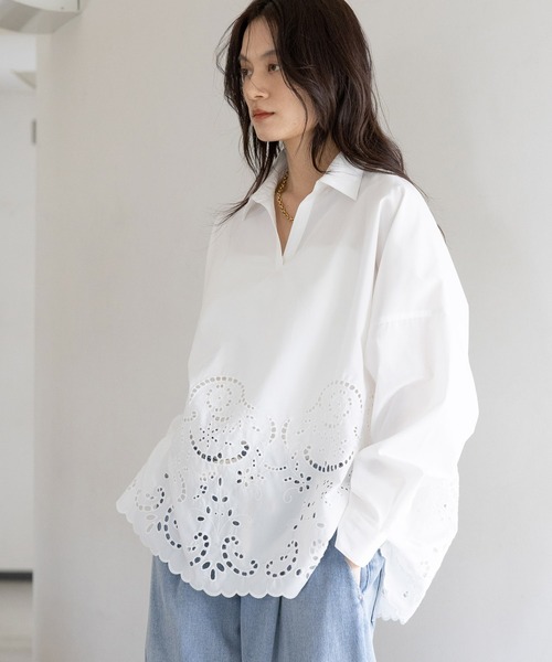 スカラップレースで華やぐ。大人が着たい主役服。【悩みに“効く”ポイント】裾の刺しゅうが、一枚で圧倒的な着映えを叶えてくれます。襟元が顔周りを整え、甘すぎない大人の抜け感を演出。裾のスカラップが、気になる腰回りを自然にカバーします。デニムから綺麗めまで、オンオフ問わず幅広く活躍する1枚です。【MATERIAL & FUNCTION】(質感):程よいハリのある質感。立体的な刺しゅうが高級感を演出。(素材):ポリエステル80% 綿20%【スタイリング】(綺麗め):白パンツを合わせ、清潔感ある都会的なお仕事スタイル。(カジュアル):デニムと合わせ、甘さを程よく抑えた大人の休日服。【商品の取り扱いについて】(洗濯):ご自宅の洗濯機でお手入れが可能です(ネット使用)。(ケア):繊細な刺しゅうを施しているため、引っ掛けにはご注意を。------------------------【お気に入り登録のおすすめ】■商品のお気に入り(♡)登録┗完売カラーの再入荷通知や、完売間近の通知、ZOZO店のみのセールなどの通知を受けることができます。■ショップのお気に入り(♡)登録┗新商品や再入荷など、いち早くブランドのお得な情報を受け取ることができます。------------------------