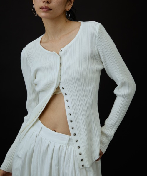【DRWCYS S/S collection】〈 Design Point 〉メタルのスナップボタンが目を引くリブカーディガン。ボタンを開け閉めする部分を変えるだけで表情が変わる一枚。柔らかく、伸縮性のあるニットはタイトなシルエットながらストレスフリーに着用できます。上の部分のボタンを開けてヘンリーネックトップス風に、下の部分を開けて今年っぽい肌見せを楽しんだり、その日の気分で様々なアレンジができます。スラックスに合わせたり、ボリュームスカートに合わせたりボトムスを選ばないのもうれしいポイント。〈 Size 〉FREE サイズ〈 Detail 〉アクリル60% ポリエステル40%透け感:なし伸縮性:あり裏地:なしケア方法:ご自宅でお洗濯可能です。単独洗い、手洗いを推奨しております。※濃色品は多少色落ちする可能性がありますのでお洗濯のさいは、淡色のものとは別にお洗い下さい。※濃色品は漂白剤入り、または漂白剤成分のある洗剤の使用はお控えください。※照明の関係により、実際よりも色味が違って見える場合がございます。※商品に付いている商品表示とアテンションタグをご確認の上、着用・お取り扱い下さい。〈 公式Instagram 〉@drwcys_official新作アイテムの情報やおすすめ商品を随時UPしております。是非チェックしてみて下さい。----------------------------------------------------〈 お買い物をよりお楽しみいただく為に 〉・商品のお気に入り登録♡をクリックして気になるアイテムをお気に入りに登録していただくと完売カラーの再入荷や、ラスト1点の通知、セールの際の通知を受ける事ができます。ブランドのお気に入り登録もご一緒にお願い致します。