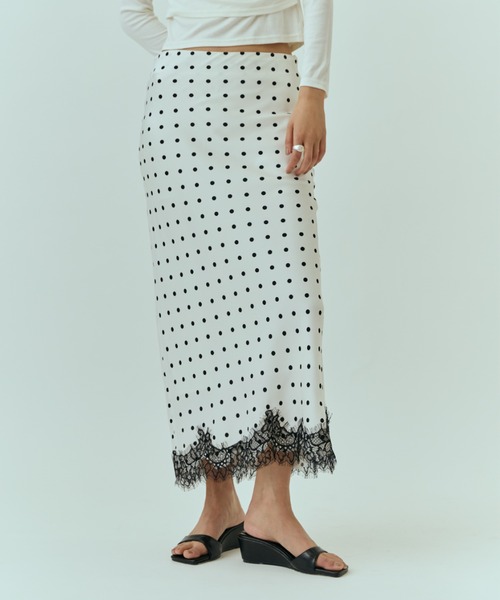 【DRWCYS S/S collection】〈 Design Point 〉今季トレンドのドットプリントのスカート。裾に華奢なブラックレースをあしらうことで大人っぽい印象に仕上げました。ナローラインが女性らしい印象を与えるスカート。腰回りをすっきりとさせきれいなラインに。すっきりとしたタイトなトップスはもちろんのことルーズトップスとの相性も◎。モノトーンカラーでドット柄も大人っぽく着用していただけるおススメのアイテムです。〈 Size 〉FREE サイズ〈 Detail 〉ポリエステル100%透け感:なし(WHTのみややあり。ベージュ系のインナーの着用をおすすめします。)伸縮性:なし裏地:なしケア方法:ご自宅でお洗濯可能です。単独洗い、手洗いを推奨しております。※濃色品は多少色落ちする可能性がありますのでお洗濯のさいは、淡色のものとは別にお洗い下さい。※濃色品は漂白剤入り、または漂白剤成分のある洗剤の使用はお控えください。※照明の関係により、実際よりも色味が違って見える場合がございます。※商品に付いている商品表示とアテンションタグをご確認の上、着用・お取り扱い下さい。〈 公式Instagram 〉@drwcys_official新作アイテムの情報やおすすめ商品を随時UPしております。是非チェックしてみて下さい。----------------------------------------------------〈 お買い物をよりお楽しみいただく為に 〉・商品のお気に入り登録♡をクリックして気になるアイテムをお気に入りに登録していただくと完売カラーの再入荷や、ラスト1点の通知、セールの際の通知を受ける事ができます。ブランドのお気に入り登録もご一緒にお願い致します。