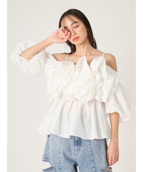 【花をモチーフにしたボリュームフリルが目を引く主役ブラウス】【Design/Styling】まるで自分が花になったような、とっておきの華やかさを表現したブラウス。縦にあしらったフリルはビッグフラワーをモチーフに、立体的かつ存在感たっぷりに仕上げました。デコルテが美しく見えるすっきりとした首周りや、二の腕カバー効果のあるボリュームスリーブ、メリハリを作るペプラムシルエットなど、スタイルアップを叶えるディテールもポイント。肩を落としてオフショルダーとしても楽しめるので、着回し力も抜群です。また、アジャスター付きのストラップと胸下に入れたゴムで、安心感のある着心地にもこだわりました。カラーは女性らしいピュアなWHT、爽やかなBLU、シックで大人なBLKの3色展開です。※照明の関係により、実際よりも色味が違って見える場合があります。またパソコン・スマートフォンなどの環境により、若干製品と画像のカラーが異なる場合もございます。予めご了承ください。商品の色味は、商品単品画像をご参照下さい。 ※商品画像はサンプルのため、色味やサイズ等の仕様に変更がある場合がございますので、予めご了承ください。