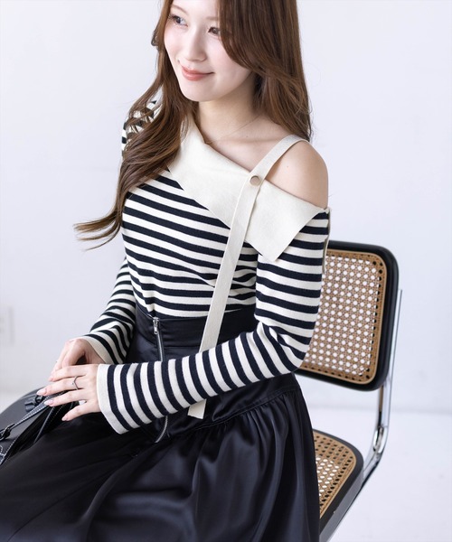 女性らしさ引き立つフェミニンニット♪セーラーカラーボーダーワンショルニットトップス【デザイン】セーラーカラーの程よい甘さが、大人の可愛らしさを引き立てるボーダーニットトップス。やわらかなニット素材と落ち着いた配色で、フェミニンながらも幼く見えないバランスに仕上げました。首元のワンショルダーデザインが顔まわりをすっきり見せ、上品な印象を演出します。【素材感】伸縮性のあるレーヨン素材伸縮性:あり/ 透け感: なし/ 裏地:なし 水洗いによる洗濯不可 / ドライクリーニング可【コーディネート】フレアスカートやチュールスカートと合わせれば、柔らかく女性らしいスタイリングに仕上がります。マーメイドスカートやきれいめパンツと合わせることで、甘さを抑えた大人フェミニンな着こなしも楽しめます。カーディガンやツイードジャケットのインナーとしても使いやすく、デイリーからきれいめシーンまで幅広く活躍する一枚です。【※お取り扱い上のご注意】1:モニター環境等により実際の商品と多少色味が異なって表示される場合がございます。予めご了承下さい。2:屋外で撮影された商品は、天候により多少実際のカラーと異なる場合があります。商品のカラーはトルソー(マネキン)の商品画像をご参照ください。3:濃い色の商品は、お洗濯や摩擦等による移染にご注意ください。4:末永くご愛用頂く為に、アテンションタグ・洗濯ネームを必ずご確認の上、着用又はお取り扱い下さい。5:生産時期により、色、サイズ、デザイン、素材の質感が多少が異なる場合がございます。あらかじめ御了承下さいませ。