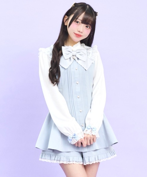 華やかな配色レースに合わせた、ハートチャーム付きリボンがお顔周りを彩ります♪袖口のミニリボンやパンツ裾のレースが、可愛さを引き立てる!