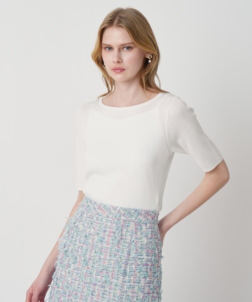 【Spring & Summer Collection 2026】 ANAYI定番のアセテートポリエステルリブ素材のシリーズ。 光沢感があり、ケアがしやすく、程よく体になじむノーストレスな編地が人気の理由。アセテートポリエステルならではのキレイな発色もお楽しみいただけます。 五分袖のボートネックプルオーバー。 デコルテを美しく見せ程よくフィットするシンプルなデザインは様々なスタイリングに合わせやすく、両裾脇のスリットが入りボトムを選びません。 1年通じて着回しがしやすく、手洗いも可能な1枚あると重宝するアイテムです。 シリーズのカーディガン(品番10261816190)とアンサンブルでの着用も可。 【付属】なし 【裏地】なし 【透け感】ほぼなし 【開き・留め仕様】なし 【伸縮性】あり 【ケア方法】手洗い可 【着用感・生地の厚さ】薄手のリブ ホワイト着用 model:176cm 着用サイズ:38 ベージュ・ブラック着用 model:174cm 着用サイズ:38 ラベンダー・ブルー着用 model:173cm 着用サイズ:38 【ANAYIサイズ表】 34サイズ:5号 XSサイズ相当 36サイズ:7号 Sサイズ相当 38サイズ:9号 Mサイズ相当 ・「商品のお気に入り登録」や「ブランドのお気に入り登録」で新商品や再入荷通知、セール通知などのお得な情報を受け取ることができます。 ・照明の関係により、実際よりも色味が違って見える場合がございます。 またパソコン・スマートフォンなどの環境により、製品と画像のカラーが異なる場合もございます。予めご了承ください。