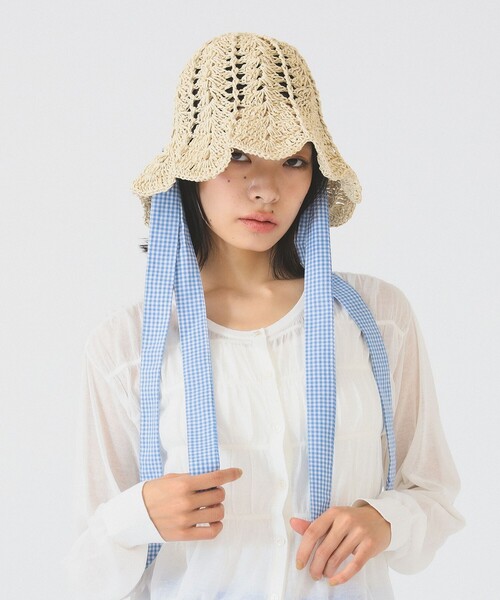 可憐に揺れるリボンがポイント■デザイン波打つようなフリルブリムが顔周りを華やかに演出する、ペーパー素材のハット。 涼しげな透かし編みのデザインに、キャッチーなギンガムチェックのリボンをプラスし、どこかレトロでガーリーなムードに仕上げました。■コーディネートワンピースに合わせたフェミニンなスタイリングはもちろん、デニムスタイルのハズしとしても活躍します。■ディテール長めに設定されたリボンは、そのまま垂らしてニュアンスを楽しんだり、あご下で結んでトレンドのハットスタイルを楽しんだりとアレンジ自在。■サイズ頭の形に優しくフィットします。■素材通気性に優れた軽い被り心地で、真夏の陽射し対策もおしゃれに叶えてくれます。※光の当たり具合やパソコンなどの閲覧環境によって、実際の色味と異なって見える場合がございます。予めご了承ください。※商品の色味は商品単体で撮影した画像をご参照ください。
