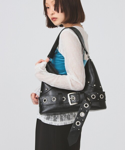 エッジの効いたディテールが光る■デザイン大振りのアイレットベルトと、ちりばめられたスタッズがエッジを添える、今季らしいムード満載のバッグが登場。 柔らかなシボ感のあるフェイクレザーを使用し、ハードなディテールながらも上品で柔らかな印象に仕上げました。■コーディネートカジュアルからモードまで幅広く対応し、スタイリングを洗練させてくれるひと品です。■ディテール体にフィットする絶妙なカーブシルエットは、肩掛けした際も収まりが良く、スタイリングをスマートに見せてくれます。■サイズデイリーな必需品がしっかり収まり、オンオフ問わず活躍。■素材裏地付き。※光の当たり具合やパソコンなどの閲覧環境によって、実際の色味と異なって見える場合がございます。予めご了承ください。※商品の色味は商品単体で撮影した画像をご参照ください。