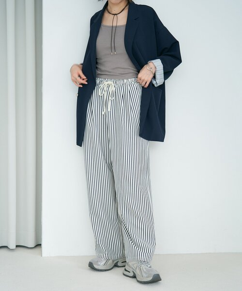 【2026SS RMAF-Remind me and forever】 穿くだけでコーディネートが完成する、主役級のストライプイージーパンツが登場! ■ デザイン ・身体のラインを拾わないワイドストレートと、絶妙なピッチのストライプ柄が最大の魅力 ・さらりとした肌触りが心地よいポリエステル100%でシワになりにくく、ご自宅でのお手入れが簡単なイージーケアも嬉しいポイント ・春夏にぴったりな凹凸感あるサッカー素材でカジュアルテイストにぴったり ■スタイリング ・ネイビーのジャケットを羽織れば、洗練されたマニッシュスタイルの完成 ・休日はオーバーサイズのTシャツやスウェットを合わせ、足元はスニーカーでラフに着こなすのがおすすめ ・パンツに存在感があるので、シンプルなトップスでも手抜きに見えず、こなれた雰囲気を演出できます ================ 裏地:なし 透け:なし 伸縮性:なし(ウエスト総ゴム) ================ -INFORMATION- ◆商品のお気に入り登録 ・完売していても再入荷時に再入荷通知を受け取ることができますので、是非ご登録ください♪ ◆ブランドのお気に入り登録 ・新商品や再入荷などの情報を受け取ることができますので、是非ご登録ください♪ ※屋外の光や照明の当たり具合で、実際の商品の色味とカラー別画像の色味に違いが発生する場合がございます。 商品の色味はスタジオ撮影の詳細画像にてご確認ください。 ※ご注文いただいた予約商品のお届け時期の確認は、注文履歴ページより行えます。 ◆返品・キャンセルについて ・着用・洗濯後の返品・ご交換は致しかねます。 ・商品到着後、着用前に商品を確認して頂きますようお願い致します。