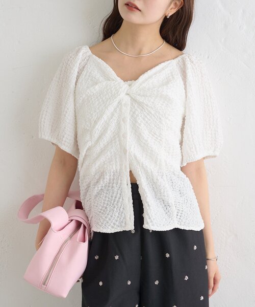 ハートネックとパフスリーブで女性らしさ溢れるブラウス※オフホワイトのお届け時期が「5月上旬」の表示となっておりますが、実際は「4月中旬」頃のお届けとなります。●デザイン・デコルテをキレイに見せてくれるハートネックデザインがポイントのブラウス。・程よいパフスリーブで甘さをプラスし、表面感のある素材が立体的な仕上がりに。・胸下部分はボタン仕様で、開き具合で抜け感を演出してくれます。・首元のリボンはチョーカー風に巻いて、スタイリングのアクセントとしても楽しめます。●スタイリング・スラックスやスカートで合わせれば、上品なフェミニンスタイルに。・デニム合わせでカジュアルダウンしても、ハートネックの女性らしさとバランスよくまとまります。・足元はブーツで合わせるとモードに、ヒールサンダルで合わせると可愛らしさをプラスできます。●おすすめスタイリングアイテムバレルBIGデニムベルト付きボリュームスラックス●素材/取り扱い方法洗濯:40度限度 手洗い/石油系ドライクリーニング可アイロン:低温120℃まで(あて布使用)タンブル乾燥:不可裏地:なし伸縮性:なし光沢感:なし生地の厚さ:うすめ------------------------------------------------------▼商品のお気に入り登録お気に入りアイテムのセール通知や完売カラーの再入荷通知、在庫残り1点などの通知を受け取ることができます。▼ブランドのお気に入り登録新商品や再入荷、セール、クーポン配布などお得な情報をいち早く受け取ることができます。▼メルマガ登録mysticのお得な情報やニュースを一足先にお届けします。------------------------------------------------------商品について※ご注文いただいた予約商品のお届け時期の確認は、注文履歴ページより行えます。※サイト上のカラー名と、お届け商品に記載されているカラー名が異なる場合がございます。※商品の色味は、撮影場所や光のあたり具合などにより色味が違って見える場合が御座います 。 また、お客様のお使いのPCのモニター環境などにより色味が違って見える場合が御座います。予めご了承の上ご注文下さい。