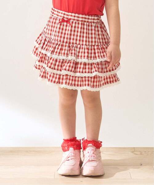 ■デザイン ガーリー好きにはたまらない。ギンガムチェックのティアードスカートが登場! インパン付きだから元気に遊んでも安心♪ UV加工で春夏のお出かけシーンにもぴったり。■スタイリング トップスをインすればすっきりまとまった印象に。スニーカーで快活なスタイルも◎ちょっとしたお出かけには、カーディガンやレーストップスと合わせておしゃれ度アップ! 【UV加工】ギンガムチェックフリルブルゾン【Lycee mineバレエシリーズ】や【サンリオキャラクターズ】ハローキティ/クロミアソート刺しゅうブラウスとセットアップ可能。【Lycee mine バレエシリーズ】普段着使いにもお出かけにもおすすめのガーリーなアイテムライン♪ かわいいカラー展開でフリルやレース、チュール使いなど女の子の大好きがつまったシリーズです。※モデル着用写真より商品写真が最も実物に近い色味です。※掲載画像の商品の色味は、光の照射や角度により実物と色味が異なる場合がございます。また表示のサイズ感と実物は若干異なる場合もございますので、予めご了承ください。【透け感】透けない【生地の厚さ】普通【伸縮性】なし【裏地】あり【ポケット】なし【アジャスター】あり