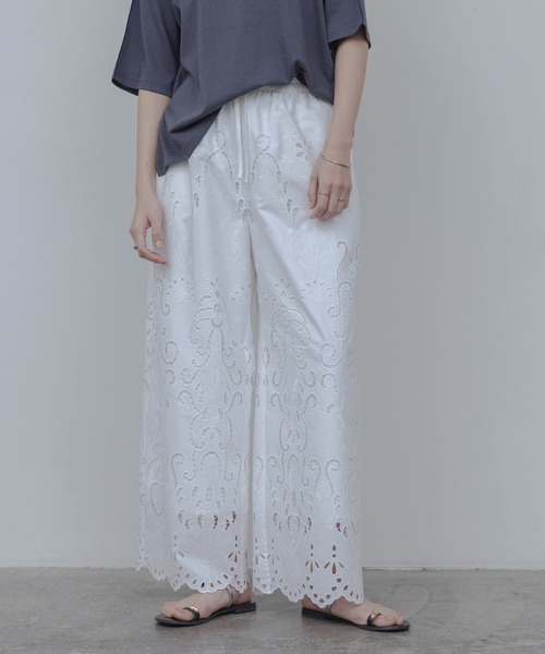 Spring-Summer Collection 立体感のある刺繍とカットワークが目を引く、コットンライクポリブロード生地を使用。 綿のようなナチュラルな風合いに、程よい艶と張り感があり、シワになりにくく扱いやすいのが特長です。 甘さを抑えたアラベスク模様が、上品でクラシカルな印象を演出します。 パンツの裾は位置指定したスカラップを贅沢に使用しており、足元から涼し気な雰囲気に。 ウエストは総ゴムで履きやすく、Tシャツと合わせるだけでラフなサマースタイルが完成します。 ●裏地:あり ●ポケット:あり ●透け感:なし ●伸縮性:なし ●季節:夏 【スタッフ着用コメント】 〈スタッフ名:kitayama〉 年齢:20代/身長:162cm/体型:細身/普段サイズ:M ・サイズ感:ウエストは総ゴムで履きやすいです。裾はスカラップの為、高身長の方でも涼しげに着用していただけます。 ・素材感:裏地もついており楽に一枚で履いていただけますが、素材感はさらっとしており暑い日にピッタリです。 ・着心地:総ゴムでとっても履きやすいですが、上品な刺繍やスカラップ使いで夏のコーデはこの一本で決まりそうです◎ ※画像の商品はサンプルです。 実際の商品と仕様や加工、サイズが若干異なる場合がございます。 ※撮影場所やイメージにより、実際の商品と色味が若干異なる場合がございます。 ※サイズに若干の個体差が生じる場合がございます。 予めご了承下さい。 【オススメの機能について】 《商品のお気に入り登録》により、完売カラーの再入荷通知、ラスト1点の通知、セールの通知も受け取ることができます! 《ブランドのお気に入り登録》により、新商品や再入荷など、イチ早くブランドのお得なセールやクーポン配布などの情報を受け取ることができます! お得な情報をGETして頂く為にも、是非ご活用くださいませ