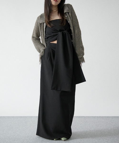"Ezick"マルチウェイで魅せる2セットアイテム【design】---ナロースカート---身体のラインを拾いすぎないスッと伸びるIライン。バックにはベンツが入っているので、足さばきも◎ウエストはゴム仕様で長時間の着用やインスタイルでも快適な履き心地に。レーヨン混の素材で裏地付きなのでロングシーズン着用しやすいのもポイント。サイドファスナーとホックで着脱しやすく、ポケット付きで実用性も兼ね揃えております。---ビスチェ---ビスチェやレイヤードスタイル、コルセットとしても着用頂けるマルチウェイアイテム。アレンジ自在な大判リボンでモードやフェミニンなど系統に合った着こなしが叶います。バックゴム仕様で体型に合わせて着用ができ、スタイリングの幅が広がります。セットで着てオケージョンスタイルや別々の着用でデイリー使いもできる着回し力抜群のアイテムです。【stylingitem】・Embroidery single jacket 刺繍シングルジャケット(643975)・Embroidery straight pants ハイウエスト刺繍パンツ【ベルト付】(643974)・flower lace trim sheer tee レーストリムシルキータッチロンT(645511)--------------------------------------------------伸縮性/ウエストゴム・バックゴムあり厚み/普通裏地/あり透け感/なしポケット/あり---------------------------------------------------※商品名とタグの記載名が異なる場合がございますが、商品に問題はございません。※サンプルにて撮影をしておりますので、実際の商品とは色味・仕様や加工・サイズ等が若干異なる場合がございます。予めご了承くださいませ。※商品の取り扱い方法につきましては、タグ等に記載されている「取り扱い上の注意」「洗濯表示」をご確認ください。※屋外での撮影画像は、光の当たり具合で色味が違って見える場合があります。あらかじめご了承ください。なお商品の色味は、スタジオ撮影の画像をご参照ください。 ....................≪INFORMATION≫......................▶Ezick(エジック)これからの時代を生きる女性が、自分らしさをもっと自由に楽しみ、磨き上げていくためのレディモードブランド。今の気分をMIXさせながらも自分らしさを表現できる、女性の等身大の美しさと憧れを提案します。-オフィシャルInstagramにて最新情報や限定情報を毎日更新中!-▼ 商品のお気に入り登録 ▼完売カラーの再入荷やラスト1点、またプライスダウンしたセール通知を受け取ることができます。ぜひご登録ください。▼ ブランドのお気に入り登録 ▼新商品や再入荷など、ブランドのお得な情報をいち早く受ける事が出来ます。ぜひご登録ください。※ご注文いただいた予約商品のお届け時期の確認は、注文履歴ページより行えます。
