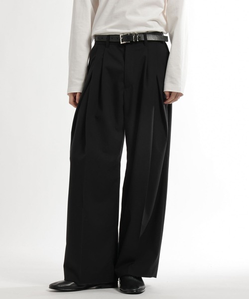 ーーー深めなタックで魅せる、美脚ワイドパンツーーーDESIGNフロントに施されたタックが縦のラインを強調し脚長効果を演出。裾に向かってストンと落ちるワイドストレートシルエットで、リラックス感がありつつも上品な印象を与えてくれる。同素材のアイテムと組み合わせることで、統一感のあるスタイリングが可能。ビジネスシーンからカジュアルな場面まで幅広く対応できます。MATERIAL中肉のウール混TR素材でポリエステルとポリウレタンにおける取り扱いやすさとレーヨン混の滑らかさとウール混による清涼感のある風合いを併せ持つ生地。デカ加工(プレスで圧力をかけて表面を滑らかにして毛羽を少なくする加工)の為、滑らかな肌触りと上品な光沢感がある汎用性の高い素材。CLEAR TEXTUREセットアップ対応ジャケットはコチラ【640741】セットアップ対応ブルゾンはコチラ【640744】セットアップ対応カーゴパンツはコチラ【652659】セットアップ対応シャツはコチラ【659615】