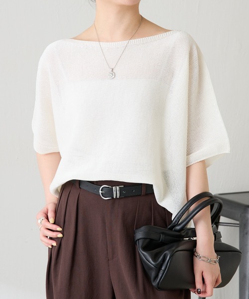 夏でも涼しく着れるサマーニット※サンプルよりも実際は着丈5㎝長くなります。 【POINT】 ・ギマ加工により、麻のような風合いにした糸(シャーリーカーン)を使用。気温が上がってからも着やすいです。 ・ゆったりめのシルエットとコンパクトな丈で、体型カバーしつつすっきり見えてバランス◎ ・ボートネックで顔周りもすっきりした印象に。ワンショルダーとしても着ていただけます。 ・二の腕が隠れる袖丈なので、腕を出したくない方にもおすすめ◎ 【おすすめコーディネート】 コンパクトな丈なのでワイドパンツと合わせても、キャミワンピの上からサラッと着るのもおすすめです。 【おすすめのスタイリングアイテム】 ・ジャージタイトスカート CLZ1061401A0002 ・シェルタリング3タックパンツ CLZ1061302A0001 ・リラックスイージーパンツ CLS5061302A0001 【素材】 綿100% 透け感:あり 裏地:なし 伸縮性:あり 光沢感:なし おすすめ着用時期:春、夏 洗濯:手洗い可 ≪返品・交換について≫ ・着用後、洗濯後の返品・交換は致しかねます。 ・商品到着後、着用前に商品状態のご確認をお願い致します。 ・ECサイトでご購入いただいた商品は、お修理を承っておりません。 【気になる商品は「お気に入り」登録を】 ハートマークをクリックし、お好きなカラーを選んでお気に入りに登録すると 入荷情報や残り1点の通知、完売カラーの再入荷、セール情報などを受け取ることができます。 ※撮影場所やお使いのモニター環境により若干お色味が異なる場合がございます。 特にロケの撮影では明るく見える傾向にございます。詳細撮影画像で色味をお確かめくださいます様お願いいたします。 ※サンプルで撮影をしております。若干の仕様が変更になる場合がございますので予めご了承の上ご注文くださいますようお願いいたします。 ※サンプルでの採寸のためあくまで目安となります。予めご了承ください。
