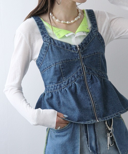 体型カバーも、今っぽさも。 +1でコーデが垢抜ける、デニムペプラムビスチェ。 【Design】 立体的なペプラムシルエットが目を惹く、デニム素材のキャミビスチェ。 ウエスト位置からふわっと広がるデザインで、自然にスタイルアップを叶えます。 フロントジップ仕様で着脱しやすく、デザインアクセントとしても◎ バックはシャーリングデザインを施し、フィット感と女性らしさを両立。 デニムのカジュアルさと、ペプラムの甘さが絶妙にマッチした1枚です。 【Material】 デニム特有のハリ感はありつつ、硬すぎない程よい生地感。 高見えするデニム素材を使用し、シーズンレスで活躍。 しっかり感がありながらも着心地が良く、デイリー使いしやすいのもポイントです。 【Coordinate】 シアートップスやロンT、スウェットと合わせてカジュアルフェミニンな着こなしに。 季節が進めば、Tシャツやタンクトップ、キャミソールとのレイヤードもおすすめ。 ワンピースの上から重ねるだけで、こなれ感のある旬コーデが完成します。 オールシーズン着回せる、頼れるレイヤードアイテムです。 ペプラムビスチェ/キャミビスチェ/体型カバー レイヤードスタイル/レイヤードコーデ シーズンレスアイテム/トレンドデニム/プラスワンアイテム ※ご覧のモニター環境により、画像の色味と多少異なる場合がございます。 ----------------------------- 透け感:なし 生地の厚さ:普通 伸縮性:なし 光沢:なし 裏地:なし 洗濯:手洗い推奨 ----------------------------- ※詳しいお手入れ方法は商品タグをご参照ください。 ※ご覧のモニター環境や撮影環境により実際の商品と多少色味が異なって見える場合がございます。 ご理解の程よろしくお願いいたします。 【お買い物をよりお楽しみいただく為に】 ▼商品のお気に入り登録をおすすめします ♡をクリックしてください。 完売カラーの再入荷や、ラスト1点の通知、 セールの際の通知を受ける事ができます。 ブランドのお気に入り登録もご一緒にお願い致します。