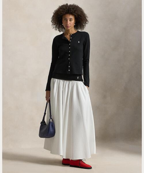 薄手の糸染めコットンを使用して流れるようなドレープを生み出し、ガーメントウォッシュで柔らかさを高めたAラインのスカート。コントラストの効いた幅の広い伸縮性のあるウエストに、シグネチャーのポニー刺繍でアクセントをプラス。 ・Aラインのシルエット / ふくらはぎ丈。 ・コントラストの効いた伸縮性のあるウエストバンド、シグネチャーのポニー刺繍入り / プルオンスタイル。 ・ウエストにシャーリング / サイドシームポケット / 裏地なし。 ・モデル身長178cm、着用サイズS。 ・本体上部分:ナイロン 51%、レーヨン 46%、ポリウレタン 3% 本体 下部分:綿 100% 装飾部分を除く ※商品の色味は、光のあたり具合など諸条件により色感が多少異なって見える場合がございますので予めご了承下さい。 ポロ ラルフ ローレン