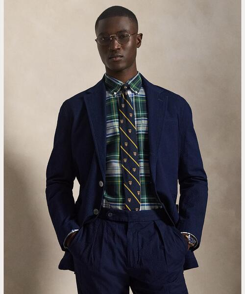 ナチュラルショルダー、ややかっちりとした胸元、部分裏地を採用し、クラシックなプレッピースタイルにモダンなひねりを加えたPoloソフト スポーツ ジャケット。インディゴ染めとウォッシュ加工を施した薄手のコットンシアサッカーを使用し、丁寧に仕立てたバージョン。天然の蝶貝ボタンがエレガントな仕上がりのアクセントをプラス。・モダンフィット:胸囲にフィット / テーラードフィットよりもゆとりのあるウエスト。・Poloソフト:ハーフライニング / Poloモデルよりもゆったりとした胸元 / ソフトなナチュラルショルダー / 高いアームホール位置。・ノッチドラペル / 左のラペルにボタンホール / 3つボタンのシルエット / 天然の蝶貝ボタン。・カフスに飾りボタン4つ。・左胸に箱ポケット / フロントウエストにパッチポケット2つ / 胸の内側にポケット2つ / ハーフライニング / ダブルベンツ。・生地や布張りの室内装飾品に色移りすることがあります。・モデル身長185cm、着用サイズM。※商品の色味は、光のあたり具合など諸条件により色感が多少異なって見える場合がございますので予めご了承下さい。ポロ ラルフ ローレン