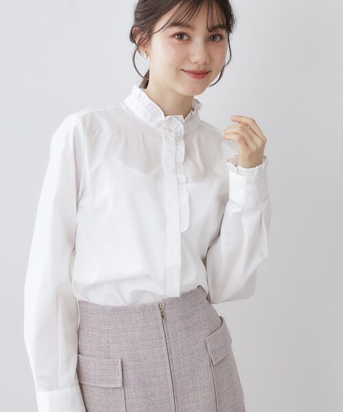 環境に配慮したエシカルブロードのスタンドフリルブラウス 【デザイン】 ・フロントと袖口ののフリルディテールがエレガントな印象を与え、華やかさを演出します。 ・スタンドカラーのデザインが首元をすっきりと見せ、女性らしいシルエットを作り出します。 ・シンプルでありながら、洗練された雰囲気を持ち、日常使いから特別なシーンまで幅広く対応。 ・ゆったりとしたシルエットが体型をカバーし、リラックスした着心地を提供します。 ・背中部分にはタックが施され、動きやすさと立体感をプラス。 ・クルーネックやカーディガンと合わせて衿と袖口のフリルをのぞかせるのもおすすめです! ・オフホワイトとサックスの無地とオフネイビーのストライプ柄で選べるアソート展開。 シーンやスタイルに合わせて選択可能です。 ・程よい丈感でインもアウトも自在。ボトムスを選ばず、オンオフ問わず活躍する1枚です。 【素材】 ・エシカルなブロード素材を使用しており、環境にも配慮した選択が可能。 ・ポリエステルとコットンのミックス素材が、適度なハリ感と柔らかさを実現。 型崩れしにくく、美しいシルエットをキープします。 ・さらりとした肌触りが心地よく、四季を通じて快適に着用できる素材感です。 ・イージーアイロン仕様で、忙しい朝のスタイリングも手軽に。 ・長時間の着用でも安心感のあるルックスを保ちます。 ・マシンウォッシャブル仕様でお手入れ簡単。季節の変わり目に重宝する軽やかな着心地で、快適に長く愛用できます。 ※照明の関係により、実際よりも色味が違って見える場合があります。また、パソコン・スマートフォンなどの環境により、若干製品と画像のカラーが異なる場合もございます。 モデル情報:身長159cm B75 W56 H81 着用サイズ:38(M) 店舗へのお問い合わせ商品番号:C58-85010 ●製品寸法: 36(S):着丈57cm B96cm 袖丈55cm 肩幅35cm 38(M):着丈58cm B98cm 袖丈56cm 肩幅36cm 40(L):着丈59cm B101cm 袖丈58cm 肩幅37cm 42(LL):着丈60cm B104cm 袖丈60cm 肩幅39cm 備考: