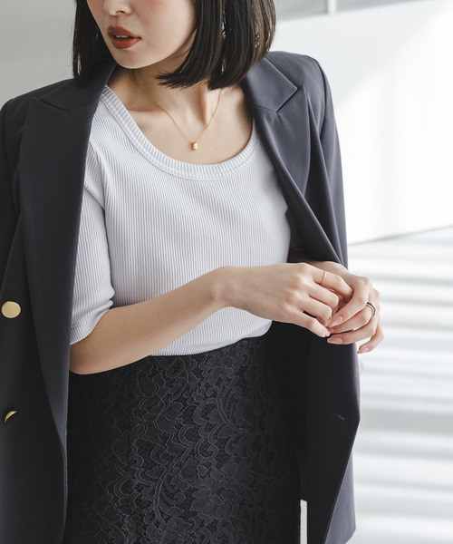 アメリカの限られた農園でしか採れない希少な綿花を原料に使用したウルティマ(ULTIMA)コットン。 繊維が長く毛羽立ちにくいため、なめらかな肌触りと上品な光沢と柔らかさが魅力です。 リブですっきりとしたシンプルなTシャツに落とし込むことで、素材の良さを最大限に発揮。 肩線はやや内側に入れているので華奢見えを誘い、身幅もやや細め、袖丈は二の腕が隠れる長さでコンパクトにデザイン。 ラウンドとUの中間くらいのネックラインにこだわり、1枚でも美しく纏えるように考慮。 ジャケットのインナーから1枚着まで非常に汎用性の高い1着です。 ベーシックなブラック・グレー・ホワイトに柔らかで上品なピンクの4色展開。 ********************** 透け感:あり(ホワイト・ピンク)、なし(ブラック・グレーB) 裏地:なし 伸縮性:あり 光沢感:なし 生地の厚さ:普通 ********************** 【スタッフ着用コメント】 年齢20代/身長:155cm/体型:やや細身/普段サイズ: 34~36 /着用サイズ:フリー サイズ感:フィット感のあるコンパクトなサイジング。 伸縮性があるので身体に馴染んで着用できます。 着丈は短めで骨盤に掛かるほどの長さ。 素材感:もちっとしていて、柔らかな風合い。 着心地:軽い着心地なので、夏まで着られそうです。 ********************** ※ブラック(001)のみ 色あせ:日光や蛍光灯の光に弱く、色あせ(変色)しやすい性質があるので、長時間の直射日光は避けてください。 ※取り扱いについては、商品についている品質表示でご確認ください。 ※こちらの商品は、NOBLEでの取り扱いになります。 直接店舗へお問い合わせの際はNOBLE店舗へお願い致します。 ※照明の関係により、実際よりも色味が違って見える場合があります。 またパソコン・スマートフォンなどの環境により、若干製品と画像のカラーが異なる場合もございます。 ※商品の色味は、商品アップ画像をご参照ください。 ブラック・グレーB着用スタッフ身長:155cm 着用サイズ:フリー ホワイト着用スタッフ身長:160cm 着用サイズ:フリー ピンク着用スタッフ身長:164cm 着用サイズ:フリー モデルサイズ:身長:163cm 着用サイズ:フリー 本体:手洗い可能