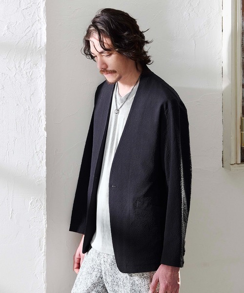 ■デザイン ノーカラーの1Bジャケット。首元が開き過ぎない様にVゾーンを狭く設定、腰ポケットをシンプルな箱ポケットにする事で、ドレカジライクな綺麗めのシンプルジャケットに作りました。前身の裏に裏地を付けて内ポケットを作り、軽く仕上げています。 ■サイズ 少し肩が落ちたオーバーサイズ設定にしていますが、ウエストシェイプを入れ、裾回りのふくらみを抑える事で、大き過ぎない程良い綺麗なシルエットに作っています。 ■素材 ポリエステルのシアサッカー素材。チェック柄に織られたドビー組織になります。 ポコポコした表面のリップル感を抑えて綺麗に見える様に仕上げています。 エアリーな軽とキックバックの効いた程良いマルチストレッチ性があり、シワになりにくく乾きやすいので、家庭洗濯で取り扱いが楽なイージーケアが特徴です。 伸縮性:あり 生地の厚さ:少し薄手(透け感はありません) 裏地:前身裏のみ(内ポケットあり) ■「メーカー品番/6164-5106」 同素材セットアップのパンツです。 ※画像の商品はサンプルです。実際の商品とは仕様・加工・サイズ・素材が若干異なる場合がございます。 ※掲載画像の商品の色味は、撮影場所や光の当たり具合などにより色味が異なって見える場合がございます。 商品の色味は、生地アップの画像をご参照ください。 また、お客様のお使いのPC・スマートフォン等のモニター環境などにより色味が異なって見える場合がございます。 予めご了承の上、ご注文ください。
