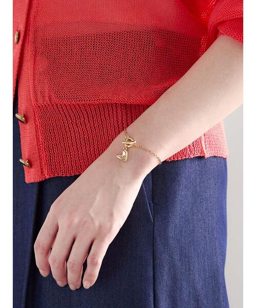 ニュアンスのあるハートモチーフが可愛らしいブレスレット。 留め具部分はマンテル仕様になっているので、簡単に着脱することができます。 動くたびにゆらゆらと揺れるチャームがアクセントに。 肌の露出が増えるこれからのシーズンに大活躍するアイテムです。 【その他採寸】 F たて:[モチーフ]1.2cm よこ:[モチーフ]1.2cm 全長:18cm ※商品画像は、撮影環境やお客様のご利用のPC・スマートフォンのモニター環境などにより実物と色味に差異がある場合がございます。 ※着用画像はサンプルを使用して撮影しております。製品と一部仕様が異なる場合がございます。予めご了承ください。 ★《お気に入り登録》でお得な情報をGET★ ① 商品ページ内のハートマークをクリック! ② 以下通知が受け取れます! 「再入荷」「ラスト1点」「特別セール」etc.. \ブランド、ショップのお気に入りも是非!/