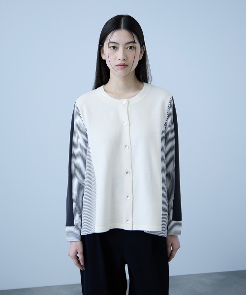 ●POINT ニットカーディガンとブラウスをドッキングさせたデザイントップスです。 クルーネックデザインでネック周りはすっきりとさせながら、バックヨーク下にタックを入れ、裾にかけて自然に広がるシルエットが印象的なフォルムに。 また、前身頃、お袖、後身頃それぞれカラーごとに異なるカラーコンビネーションも特徴です。 オフホワイトカラーはお袖がチャコールグレー、後身頃がホワイトベースのストライプテキスタイルのコンビネーションに、ネイビーカラーはお袖がオフホワイト、後身頃がサックスカラーのテキスタイルのコンビネーションになっていて、まるでアート作品のような一枚です。 ---------------------------------- 透け感:淡色のみややあり 厚さ: 普通 伸縮性:あり 裏地: なし ポケット: なし ---------------------------------- ---------------------------------------------------------------- 洗濯方法 家庭洗濯:液温は40℃を限度とし、手洗いができる。 自然乾燥:日蔭の平干しがよい。 アイロン:底面温度120℃を限度としてアイロン仕上げができる。 ドライクリーニング:石油系溶剤による弱いドライクリーニングができる。 ---------------------------------------------------------------- ■モデル身長 165cm 着用サイズ M ※画像の商品はサンプルとなりますので実際の商品と仕様、加工、サイズが若干異なる場合がございます。 ※お客様のモニター環境により実際のお色と多少異なる場合がございます。 ※撮影状況や光の当たり具合により、色合いが異なって見える場合がございます。 ---------------------------------- ▼商品のお気に入り登録 ハートマークをクリックし、お好きなカラーを選んでお気に入りに登録 完売カラーの再入荷通知や、ラスト1点の通知、セールの通知も受け取ることができます。 ▼ブランドのお気に入り登録 新商品や再入荷等、いち早くブランドのお得な情報を受け取ることができます。 ----------------------------------