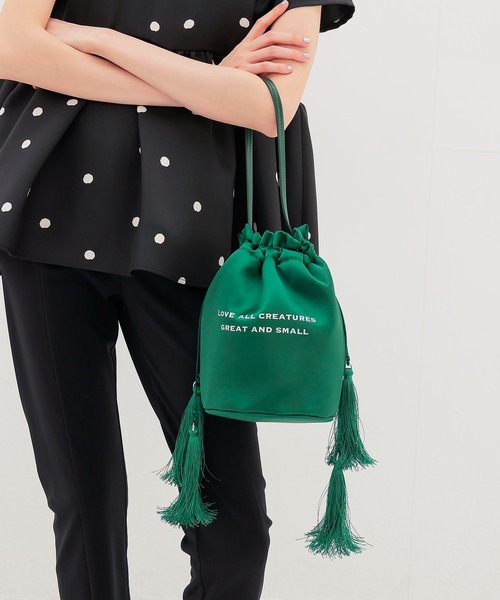 ■DESIGN今シーズンのテーマメッセージをプリントしたカジュアルな巾着バッグ。艶やかな素材感とポップなカラーがスタイリングのアクセントに。紐先にあしらったボリューム感のあるタッセルが遊び心をプラス。小脇に抱えられるサイズ感で、程よい収納力を備えたデイリー使いに最適なアイテムです。ロゴにあしらわれた“Love all creatures, Great and small” は、「すべての生きとし生けるものを愛しましょう。大きなものから小さなものまで。」というメッセージが込められています。【TSURU by Mariko Oikawa】どこにもない美しい靴をという思いから生まれた日本発のブランド、TSURU by Mariko Oikawa。シューズをメインにバッグ,ヘアアクセサリーなどその世界感を様々なTsuruとして展開しています。