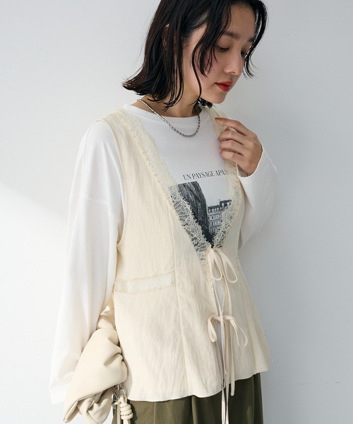 繊細レースで叶える、さりげない大人の色気 サテンのなめらかな質感と繊細なレース使いが、上品で女性らしい印象を演出します。 ランジェリー風のデザインながら、程よい透け感と落ち着いた表情で、日常のコーディネートに自然になじみます。 深めのVラインがデコルテをすっきりと見せ、レイヤードスタイルに奥行きをプラスします。 前後で結べるリボン仕様により、フィット感の調整がしやすく、自分らしい着こなしが楽しめます。 カットソーやシャツ、ニットの上に重ねるだけで、いつもの装いがぐっと華やぎます。 甘さを抑えたセンシュアルな雰囲気で、カジュアルシーンにも取り入れやすい一枚です。 透け感[ややあり] 生地の厚さ[普通] 光沢感[ややあり] 伸縮性[なし] 裏地[なし] ポケット[なし] ※モデル着用画像は、光の当たり具合で色味が違って見える場合がございます。 ※お使いのモニター環境によって商品の色味が違って見える場合がございます。 ●Green Parks (fuuwa / topic / sara)● (グリーン パークス) 毎日を、ここちよく。今日のわたしを、ちょっと素敵に。 Green Parksは、ライフスタイルやシーンに寄り添うスタイリングで、 自然体で毎日を楽しむあなたを後押しします。 ▼ 商品のお気に入り登録がおすすめです ▼ 商品ページ内のハートマークをクリック。完売時の再入荷や、最後の1点の通知、コーディネート画像がアップされたとき、お得なお値下げの際の通知を受ける事ができます。 【お知らせ】ページでも通知が確認できます。