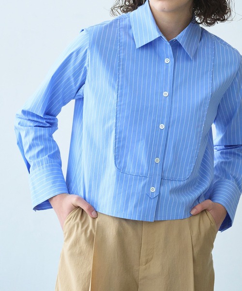 端正なフォルムで魅せるショートドレスシャツ ハリ感のあるポリエステル綿素材を使用し、 きちんと感がありながらも軽やかな着心地を実現。 一枚としても軽い羽織としても活躍する万能シャツです。 ポリエステル高混率で、シワになりにくく、型崩れしにくいので、 忙しい朝もアイロン要らずで着て頂けます。 気分の上がるピンクや、今季注目のサックスストライプなど、 春を感じるカラー展開で、冬から春のスタイリングを自然につなぎます。 ストライプ柄には、ポリウレタン混のナチュラルストレッチを取り入れ、 きれいめな表情とほどよい反発感を兼ね備えたピンストライプ生地を使用。 きちんとした襟元や、クリーンに仕上げた袖口など、 シャツ本来の端正なディテールはそのままに、 ドレスシャツの要素をショート丈デザインに落とし込んだ一枚。 コンパクトな丈感がスタイルバランスを取りやすく、 ボトムとの組み合わせ次第で表情が変わります。 オンにもオフにも寄り添う洗練ショートシャツです。 -------------------------- 透け感:なし 裏地:なし 伸縮性:無地なし・ストライプ若干あり 光沢感:なし 生地の厚さ:普通 -------------------------- 【モデルスペック】 身長:174㎝、着用サイズ:F ※照明などの関係により、実際と色味が違って見える場合がございます。予めご了承ください。 商品の色味は、商品単品画像をご参照下さい。