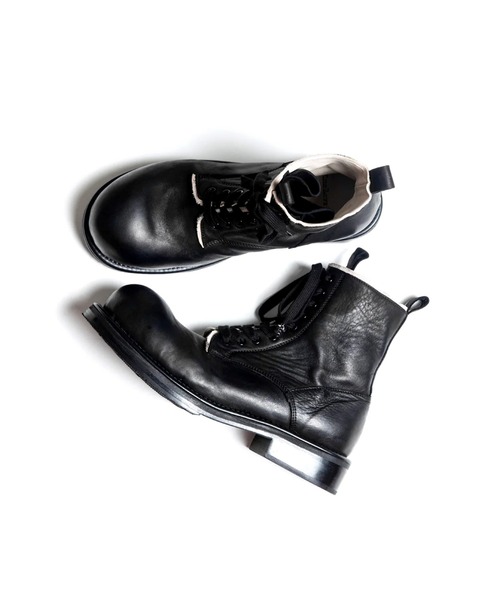 "A rounded toe hops forward in this lace-up boot. In the ink-black dark, Walt’ s old heartbeat quietly lingers."(丸みを帯びたトゥが跳ねるように前へ進むレースアップブーツ。インク色の闇に、Waltの鼓動がこっそりと息づく。)- descriptionWaltの兄弟分のようなレースアップブーツ。緻密に計算されたシルエットのバランスが見事な一足。Walt同様にウォッシュ版とスカルボーン版の2種をラインナップ。ウォッシュ版は馬革の敢えて傷の多い銀面を使用。適度なエイジング感を与え、革本来の柔らかさや足なじみの良さを引き出すためにウォッシュ加工を施したもの。スカルボーン版は同様の馬革を洗いをかけずにそのまま使用している。- sole劣化しにくい国産ベンズ(革を圧縮したもの)+合成ゴム半貼り中板にEVスポンジを使用することで歩行時のクッション性と湾曲をサポート- constructionセメント-KIDS LOVE GAITE-Designer: 山本真太郎東京生まれ。1990年に15歳で渡英。Camberwell College of Arts在籍後、「The Old Curiosity Shop」にて靴づくりを学ぶ。2000年に帰国後、東京・浅草のシューズメーカーで修行を重ね、2008年に自身のブランド「KIDS LOVE GAITE」をスタート。1990年代のロンドン・ストリートカルチャーに培われた反骨精神と芸術的視点から生まれるデザインを、職人の町・浅草で磨かれた確かな技術で具現化する「KIDS LOVE GAITE」のシューズは、山本らしい精巧な狂気をまとった無二のプロダクトと言える。※店舗と在庫を共有しておりますので、受注確認メールが届いてもご注文のタイミングによりましては売り切れになる可能性がございますので、予めご了承ください。※商品の色味につきまして、撮影環境、お客様のお使いのPCのモニター環境により実際のカラーと画像の色味が違って見える場合が御座います。