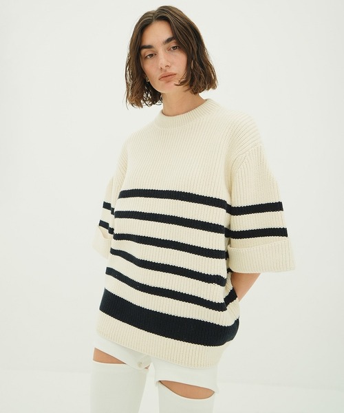 2026 Spring&Summer Collectionオーバーハーフスリーブニットトップスバルキーなサイズ感と袖の立体的なシルエットがポイントのニットトップス。ボリュームのある膨らみ感を出すために、3種類の異なる素材を使用し、絶妙なキックバック感を出した拘りの糸を使用しています。ローゲージで片畔編みで表現し、半袖ながら重厚感のあるニットに仕上げました。ヒップが隠れる丈感と、長めの半袖丈によりスタイルカバーも可能。今季はBORDERとGREENが新色です。---------------------------裏地:なしストレッチ:あり透け感:なし---------------------------※袖丈はロールアップした状態の長さです。※光の当たり具合や端末等の閲覧環境によって、実際の色味と異なって見える場合がございます。予めご了承ください。※表記サイズは商品の実寸で、布製品の特性上、表記サイズと多少の誤差が生じる場合がございます。※画像の商品はサンプルの為、実際の商品と色味、仕様、加工、サイズ、素材等が若干異なる場合がございます。