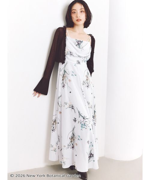 「The New York Botanical Garden」 と「SNIDEL(スナイデル)」初のコラボレーション 【大人エレガントなフラワーキャミワンピース】【Design/Styling】世界で先端的な植物学研究所として知られている The New York Botanical Garden とSNIDELとの初のコラボレーションが実現! The New York Botanical Gardenの希少本コレクションより 厳選したボタニカルアートを組み合わせたSNIDELオリジナルプリントでお作りした、すっきりと大人な表情のキャミロングワンピースが届きました。艶感と落ち感のある軽やかなサテン生地を使用し、胸元にドレープ感を加えてドレッシーに仕上げています。胸下位置に高めのウエスト切り替えを入れ、フロント胸位置はふんわとやわかな印象に。背中側にはたっぷりとゴムシャーリングを加えてフィット感を出し、美シルエットを演出します。背中側のファスナーで着脱いただけるデザインです。後ろウエスト位置には細リボンを加えて愛らしく仕上げました。カーディガンやジャケットなど、合わせるアイテムや小物次第で、普段使いにもパーティーシーンにも活躍。裏地付きです。肩紐の長さはリボンで調節いただけます。【Fabric】アイボリー、ラベンダー、ネイビーの3色展開です。透け感:なし裏地:あり伸縮性:なし光沢感:なし生地の厚さ:やや薄手【おすすめ骨格タイプ】■骨格ストレート■骨格ウェーブ■骨格ナチュラル※照明の関係により、実際よりも色味が違って見える場合があります。またパソコン・スマートフォンなどの環境により、若干製品と画像のカラーが異なる場合もございます。予めご了承ください。商品の色味は、商品単品画像をご参照下さい。 ※商品画像はサンプルのため、色味やサイズ等の仕様に変更がある場合がございますので、予めご了承ください。