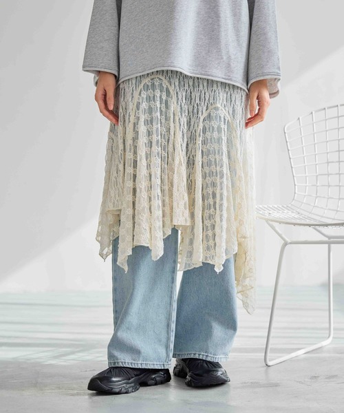 シンプルなコーデに鮮度をプラスマルチに使えるレースビスチェワンピースーーー【素材】2種類のストレッチレースを使用。華やかな印象でトレンド感のある一着です。【デザイン】2種類のストレッチレースを切り替えたビスチェ風ワンピース。イレギュラーに切り替えたアシンメトリーなヘムラインがポイントで、よりお洒落な印象に。胸元でビスチェ風に着用したり、パンツに重ねたりと幅広い着こなしをお楽しみいただけます。レース ビスチェ ワンピーーー【スタイリング】カットソーやシャツに重ねてビスチェ風に着用するのがおすすめ。胸元は総ゴムなので、ウエストまで落としてパンツレイヤードのアクセントとしてもお使いいただけます。