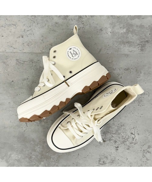厚底とキャンバスアッパーのコンビネーションがトレンド感満載なスニーカーが登場★シューズ内側のアンクルパッチが可愛い♪シーズン関係なく、どんなコーデにもマッチする可愛いシューズです。シューズコレクションに取り入れたいデイリーユースアイテム◎