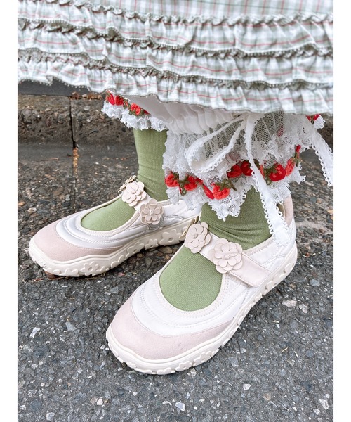 ベルトと、ソール部分それぞれに可愛らしいお花のパーツをあしらったベルクロスニーカー。ベルトのところには、ベルトと同じ色合いのお花のパーツを左右3つづつあしらった。ソールのところには、全面にソールと同色のお花のパーツを大小さまざまな大きさのものをランダム敷き詰めてにぎやかに。フロントにもソールにもお花のパーツをいっぱいあしらって華やかな仕上がりに。クッション性のある中敷き入りで軽やかな履き心地です。