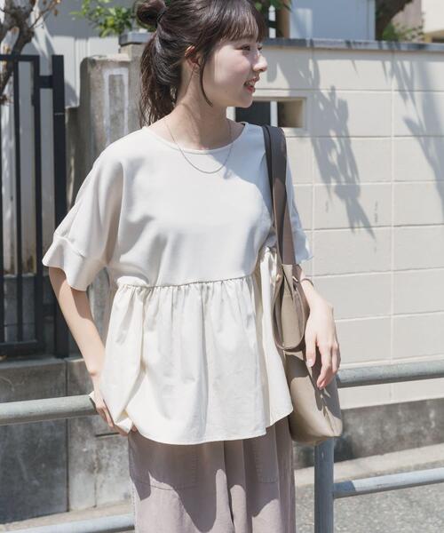 一枚で整う、大人かわいい定番ドッキングトップス 毎シーズン支持を集めている、異素材ドッキングデザインの半袖トップス。滑らかなポンチ素材とハリ感のある素材を組み合わせ、上半身はやさしく、裾にかけてふんわりと広がるシルエットに仕上げました。自然に体のラインをカバーしながら、すっきりとした印象をキープ。さりげないディテール使いと着心地の良さで、長く愛されてきた理由を感じられる一着です。日常に取り入れやすく、毎年手に取りたくなる定番アイテム。 【2026 Spring/Summer】【26SS】 ※商品画像は、光の当たり具合やパソコンなどの閲覧環境により、実際の色味と異なって見える場合がございます。予めご了承ください。 ※商品の色味の目安は、商品単体の画像をご参照ください。 ▼お気に入り登録のおすすめ▼ お気に入り登録された商品は、マイページにて現在の価格情報や在庫状況の確認が可能です。 お買い物リストの管理にぜひご利用ください。 素材感 透け感 : ややあり(OFFのみ) 伸縮性 : あり(上身頃のみ) 裏地 : なし 光沢 : なし ポケット : なし Free