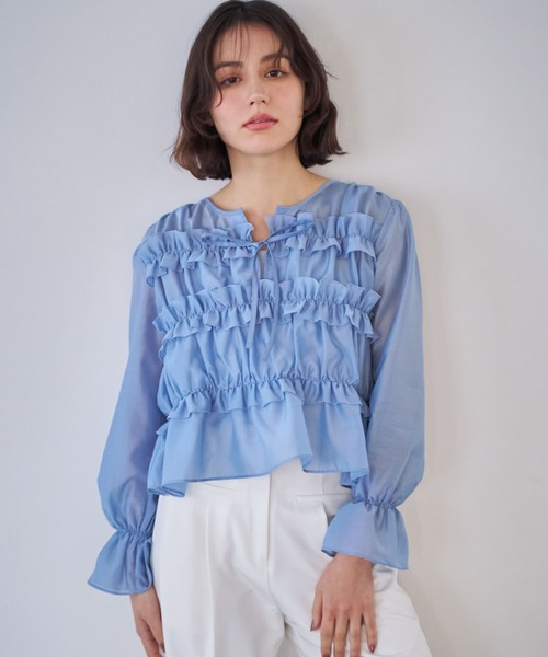 程よい張り感のある上品なシアー素材を使用したシャーリングブラウス。 ギャザーとフリル使いが華やかなデザインポイントです。 コンパクトなフォルムで、軽いアウターやジャケットのインナーとしても、タックアウトでのスタイリングも自在。 アジャスター付きのインナーキャミがセットになっています。 胸元のリボンは自分で結ぶ仕様です。 ■商品特徴 裏地:あり 生地の厚さ:薄手 透け感:あり 伸縮性:なし ポケット:なし ファスナー:なし ※不良品や配送不備以外での返品・交換はお受けいたしかねます。あらかじめご了承ください。 ※掲載商品はサンプルのため、実際の商品とは色味・仕様・加工・サイズ等が若干異なる場合がございます。あらかじめご了承ください。 ※商品の詳細な色味・仕様につきましては、商品単体のトルソー画像をご参照ください。 ※撮影時の照明やご利用のパソコン・スマートフォンの設定により、実際の色味と異なって見える場合がございます。あらかじめご了承ください。 ------------------------------------------------------------ 【お気に入り登録】でお得にお買い物! ■商品のお気に入り登録 完売カラーの再入荷や在庫残り1点の通知、値下げの通知などを受け取ることができます。 ■ブランドのお気に入り登録 新商品や再入荷情報、クーポン配布などのお得な情報を受け取ることができます。 ------------------------------------------------------------