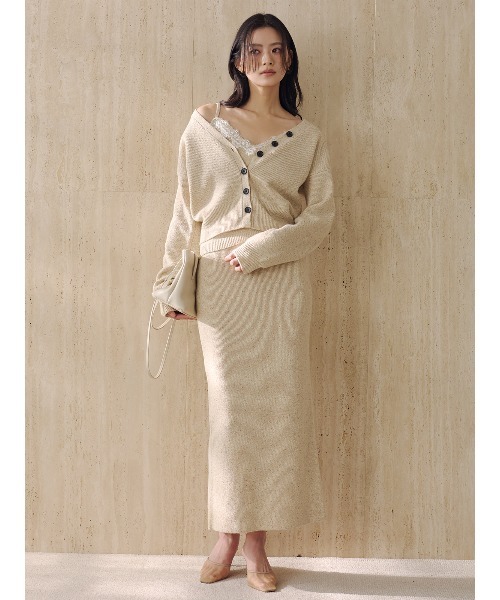 女性らしい抜け感スタイリングが叶う3ピースニットアップ ■Design 奥行きのある表情が魅力のメランジ糸で編み立てた、ニットカーディガン・タイトスカート・キャミソールの三点セットアップ。 繊細な色の重なりが生むニュアンス豊かな風合いが、装いに静かな華やぎと品格を添えます。 カーディガンは肩を落としても美しく決まる抜け感のあるリラックスシルエット。 身体を包み込むようなやわらかな編地がエレガントでありながらも気負いのない佇まいを演出します。 タイトスカートは身体のラインを拾い過ぎない計算されたフォルムで、タテのラインを強調しながらも上品な印象に。 深めに入れたスリットが足さばきを良くし、見た目の美しさと実用性を兼ね備えています。 インナーは衿ぐりに繊細なスカラップレースをあしらったニットキャミソール。軽やかで肌なじみの良い天竺組織に仕上げ、快適な着心地を叶えました。 ■Fabric メランジ糸は複数の色味を持つ原料や異なる色に染めた繊維を撚り合わせて作られる糸なので単色にはない奥行きとニュアンスのある表情が特長です。 色と色が自然に溶け合うことで編地に立体感と陰影が生まれ上品で洗練された印象を演出します。 ■Coordinate カーディガンの隙間から覗くレースディテールが今年らしいさりげないアクセントとなりスタイリングに奥行きを与えます。 それぞれ単体でご着用いただくのは勿論、シーンや気分に合わせた着こなしが楽しめるのも魅力です。 =================================== 裏地:スカートのみあり 透け感:無し 光沢感:無し 伸縮:有 ケア方法:手洗い ===================================