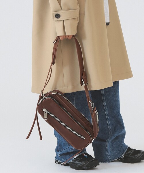 収納力とデザインを両立■デザイン横長のシルエットと、大胆にあしらわれたシルバーの斜めジップが目を引くバッグ。ショルダーストラップには取り外し可能なミニケースが付き、イヤホンや鍵などすぐに取り出したいアイテムの収納にぴったりです。■コーディネートシンプルなTシャツやコートに合わせるだけで、洗練されたテック・モードな印象に仕上がります。■サイズ小さめながらもポケットが多く、スマホや財布、ポーチなどの必需品をスマートに収納できます。■素材軽量なナイロン素材で、デイリーユースから旅行のサブバッグまで幅広く活躍。※光の当たり具合やパソコンなどの閲覧環境によって、実際の色味と異なって見える場合がございます。予めご了承ください。※商品の色味は商品単体で撮影した画像をご参照ください。