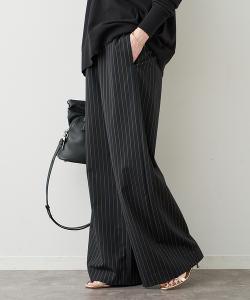 大好評のEffortless Wool ストライプパンツが今シーズン再入荷!品のある梳毛を使用したEVERYDAY I LIKE. のワイドパンツ。イエローゴールドのストライプ柄とダークネイビーのコンビネーションが高級感ある大人のトラッドを演出してくれます。ウエストはゴム仕様のイージーな穿き心地ながら、艶と落ち感のある上品な1着。太すぎずすっきり見えるシルエットのワイドパンツなので、ボリュームのあるニットやシャツ等、幅広いトップスと合わせやすいのも魅力。素材選びにこだわりを感じるモダンなストライプパンツ。※同一商品:25030500814030(若干の仕様変更がある場合がございます。)※取り扱いについては、商品についている洗濯表示にてご確認下さい。※照明の関係により、実際よりも色味が違って見える場合がありますまたパソコン・スマートフォンなどの環境により、若干製品と画像のカラーが異なる場合もございます。※商品の色味は、商品アップ画像をご参照ください。※こちらの商品はお一人様1カラー・1サイズにつき1点までの購入とさせていただきます。モデルサイズ:身長:163cm 着用サイズ:36本体:ドライクリーニング